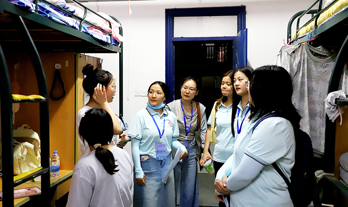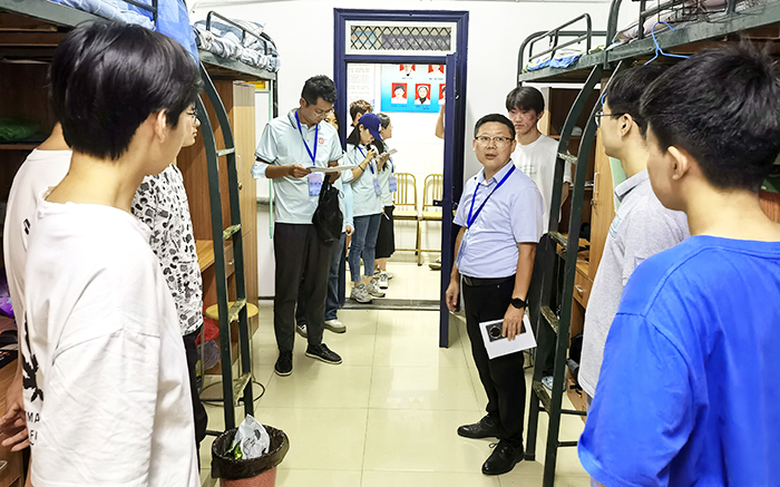 陈富汉老师详细询问了新生进校感受,同学们也积极地回答老师的问题,宿舍内气氛轻松温馨。老师们适时给同学们进行安全提醒:在宿舍要注意用电安全,不可使用大功率电器;注意个人财产安全,出宿舍要记得锁门;防范电信诈骗要牢记,新型诈骗手段需防范。同学们认真听着老师们的叮嘱,不时点头表示赞同。最后陈富汉老师希望同学们要尽快调整自我作息,进入学习状态,在新学期树立好目标,养成良好的生活习惯,珍惜这美好充实的大学时光。