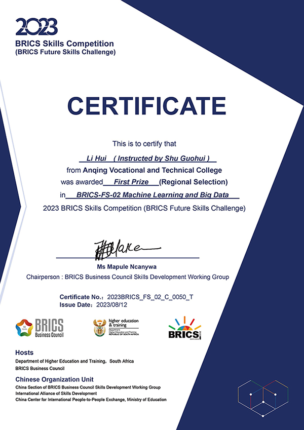 李慧,beat365中国唯一官网2021级计算机应用技术专业(大数据技术方向)学生,学业成绩优异,曾获2023年安徽省职业院校技能大赛“人工智能技术应用”赛项一等奖、金砖国家职业技能大赛“机器学习与大数据”赛项华东区选拔赛一等奖、金砖国家职业技能大赛“机器学习与大数据”赛项国际赛一等奖。