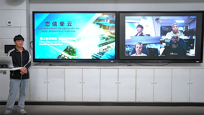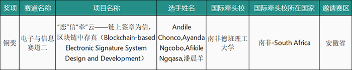本次参赛队由信息技术学院金鑫和陈小祥老师指导,三名南非德班理工大学学生Andile Chonco、Ayanda Ngcobo、Afikile Ngqasa和beat365优秀选手潘晨羊共同组队,以区块链电子签章系统开发为项目内容参赛。该项目来源于该生实际开发的一个区块链电子签章系统项目,系统采用FISCO BCOS作为底层平台,利用区块链技术的去中心化、不可篡改和透明性等特点,确保电子签章的真实性和安全性。该系统实现了电子签章的生成、验证、存储和管理等功能,用户可以通过该系统进行电子文档的签章和验证操作,体现了较高的技术水准和复杂度。