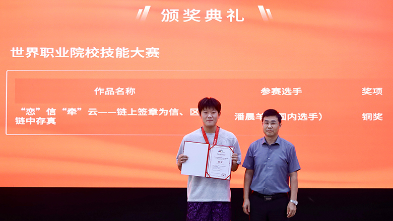 在备受瞩目的世界职业院校技能大赛颁奖环节,程飞副校长为金奖获得者颁发了获奖证书和奖牌,学院领导疏国会为国际组铜奖获得者颁奖。当获奖选手佩戴奖牌、手捧证书的那一刻,全场响起经久不息的掌声,将典礼推向高潮。(注:部分获奖选手未能到场,委托其他同学代为领奖)