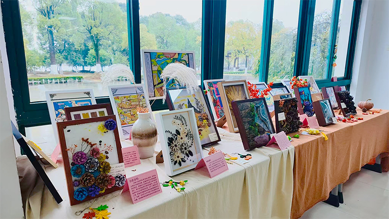 学生板块集中展示数字媒体专业学生的实践成果。在汪俊老师指导下,同学们以秋日元素为创作灵感,灵活运用树脂黏土、松果、落叶、衍纸等多元材料,创作出一系列装饰画与手工艺品。通过石英砂肌理、黏土立体造型、水粉绘画等形式,作品生动演绎了“从观察秋天到创造秋天”的美学过程。每件作品附有创作说明,清晰呈现学生在色彩、构图与设计思维方面的成长轨迹。