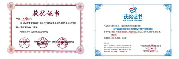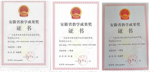 学生在安徽省职业院校技能大赛中荣获一等奖、“挑战杯”大学生课外学术作品竞赛全国三等奖、中国国际大学生创新大赛国赛银奖、铜奖。