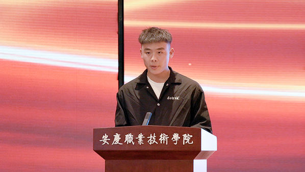 获奖选手代表汪成分享了他在大赛训练与比赛过程的艰辛与收获。在比赛中队友因病离开赛场,他一个人坚持完成所有比赛任务并取得优异成绩的事迹感动了与会人员。他的坚持与拼搏、友谊与合作的比赛精神值得同学们学习。