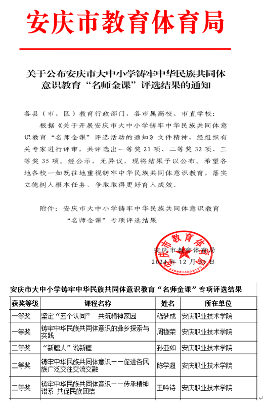 近日,由中共安庆市委高等教育委员会、安庆市教育体育局联合主办的安庆市大中小学铸牢中华民族共同体意识教育“名师金课”评选结果新鲜出炉。beat365五位思政课教师凭借扎实的理论功底、创新的教学设计和优秀的教学能力,取得优异成绩。嵇梦成、周稳荣老师获一等奖,孙亚如、陈学超和王吟诗老师获得二等奖,获奖情况在安庆市属院校名列前茅。