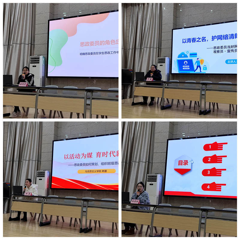 任利霞老师以“小委员大作用——思政委员的角色与定位”为主题,从角色定位、作用发挥、成长发展三方面系统阐释思政委员的使命担当。强调思政委员是贯通“学校——学院——班级”三级思政网络的关键纽带,需以精神品格涵养、理论素养提升、实践技能锤炼为核心,当好思政课教育小能手、思政课教师小助手、辅导员老师小帮手、师生沟通交流桥梁、同学成长的引路人。