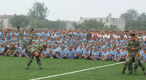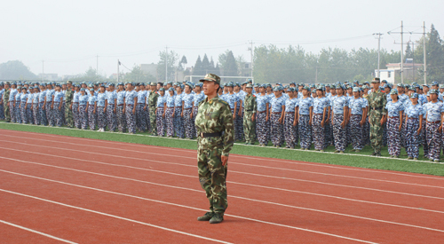 9点整,大会在《歌唱祖国》的歌声中开始。方祖中副市长、高开甲书记、孙晓峰院长、曹中校参谋长检阅了各营新生,并向他们致以亲切的慰问。在雄壮的解放军进行曲中,各营进行了分列式表演。各连队新生迈着整齐矫健的步伐、喊着激昂嘹亮的口号依次通过主席台,接受领导和来宾们的检阅,展示他们刻苦训练的成果。随后,承训部队教官进行了擒拿格斗表演。新生和教官的精彩表现赢得了阵阵掌声。