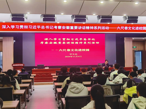 报告会从回顾习近平总书记考察桐城足迹开端,介绍习近平总书记在重温张吴礼让典故,察看桐城历史文化展陈后,提出六尺巷承载着中国古人的历史智慧,要弘扬好中华民族传统美德,相互礼让、以和为贵,解决好民生问题,化解好社会矛盾,让我们的社会更加和谐。随后报告会向全体人员介绍了六尺巷的由来,“父子双宰相”“三代得谥”“四代讲官”“六代翰林”等历史故事和以“礼让”为核心要义的六尺巷文化内涵。介绍了清河张氏以“学”“德”“廉”“俭”“让”为主要特点和麻溪吴氏注重德行修养的优良家风,并提出传承好优良家风具有非常重要的现实意义。最后报告会还详细阐述了以“听、辨、劝、借、让、和”为规程的六尺巷调解工作法和新时代六尺巷工作法具体内涵。整场报告内容丰富、通俗易懂,把哲学道理与身边故事进行了深度融合,对全体师生深入学习贯彻习近平总书记考察安徽重要讲话精神提供了有力指导,报告会气氛热烈,赢得了现场观众的阵阵掌声。