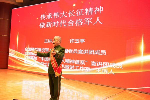 欢送会从红色宣讲开始,全国模范退役军人、皖北烈士陵园许玉亭红色宣讲工作室负责人许玉亭为全体人员作题为《中国共产党人精神谱系——长征精神》宣讲报告。李五一宣读了beat365毕业生2025年春季从迎江区入伍的预定新兵名单。六个二级学院的主要负责同志分两批为预定新兵佩戴入伍绶带和红花。随后,预定新兵毕业生通过向家长代表敬献鲜花的方式表达对家长的感谢。