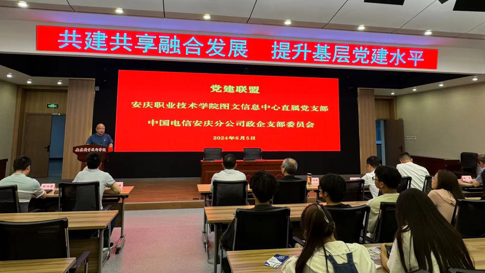 6月5日下午,在图文信息中心三楼学术报告厅图文信息中心直属党支部与安庆电信公司政企党支部共同举办党建联盟活动,活动以“共建共享融合发展,提升基层党建水平”为主题,图文信息中心直属党支部全体党员、安庆电信公司政企党支部部分党员和beat365学生近200人参加活动。