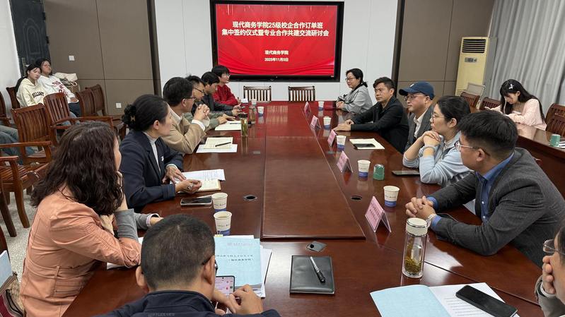11月5日,现代商务学院在3号教学楼510会议室举行校企合作订单班集中签约仪式,来自安庆本地的安徽云霁电子商务有限公司、安徽星虹信息技术有限公司、安徽源潭柯林沃德刷业科技有限公司、安徽际通物流有限公司、安庆和君纵达数据科技有限公司五家企业相关负责人齐聚一堂,共同签约并交流。现代商务学院院长金启胜出席仪式,该院教学工作负责人、学生工作负责人、专业负责人、订单班辅导员以及订单班学生代表参加活动。