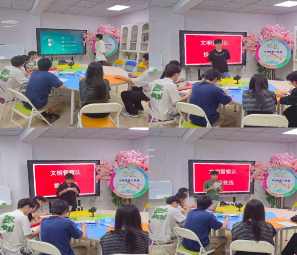 换届选举环节正式开始,参与竞选的候选人依次上台进行竞选演讲,他们围绕自我介绍、社团认知、才艺表演及未来工作规划展开阐述。经过11位候选人的竞选演讲,社团指导老师和上届骨干成员秉承公平、公正、公开的原则,根据文明督察队竞选评分表选举产生了文明督察队新一届骨干成员。