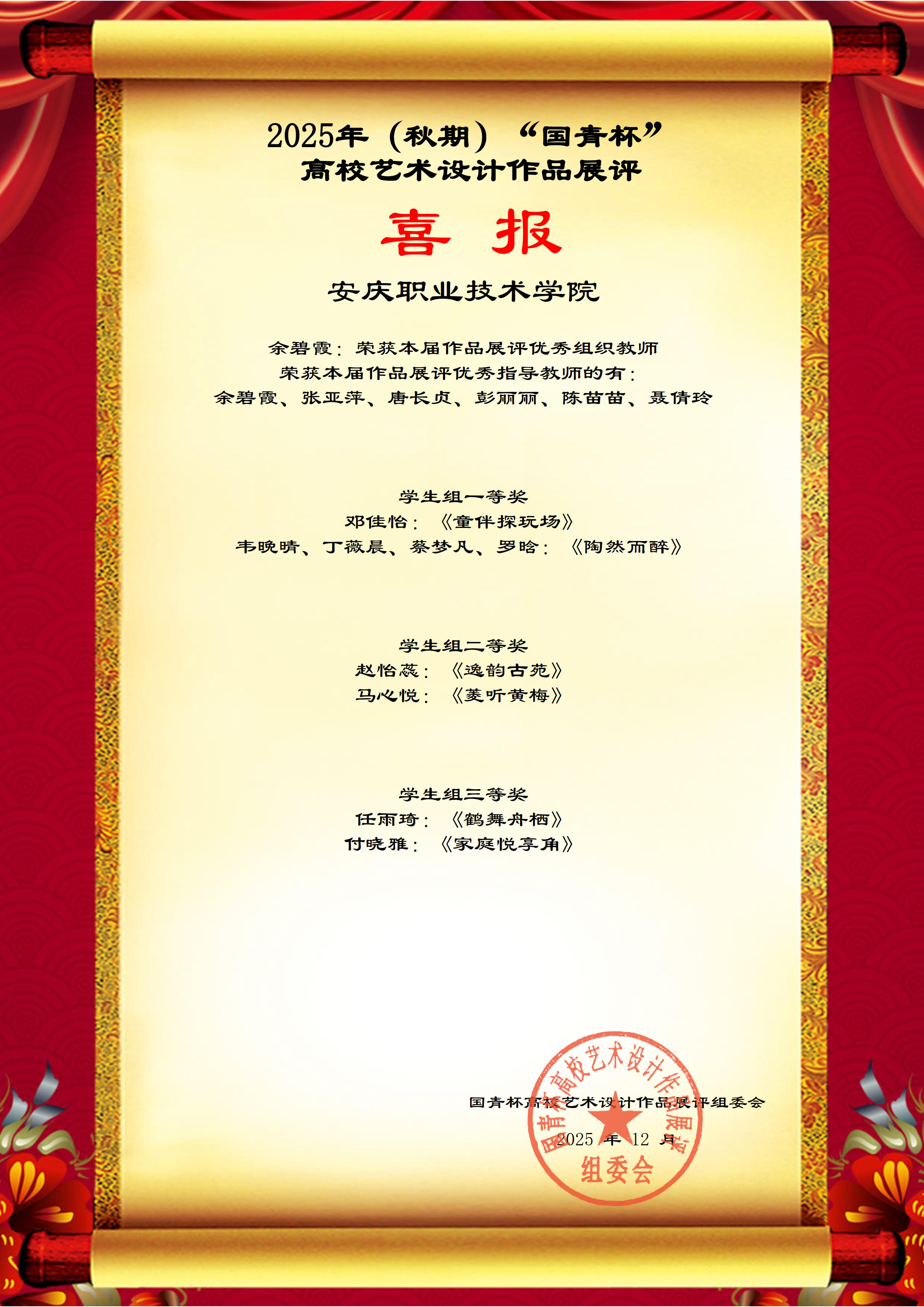 近日,以“智能·共生”为主题的2025“国青杯”全国高校艺术设计作品展评活动圆满落幕,经beat365园林技术专业师生共同努力,6件作品获得佳绩。