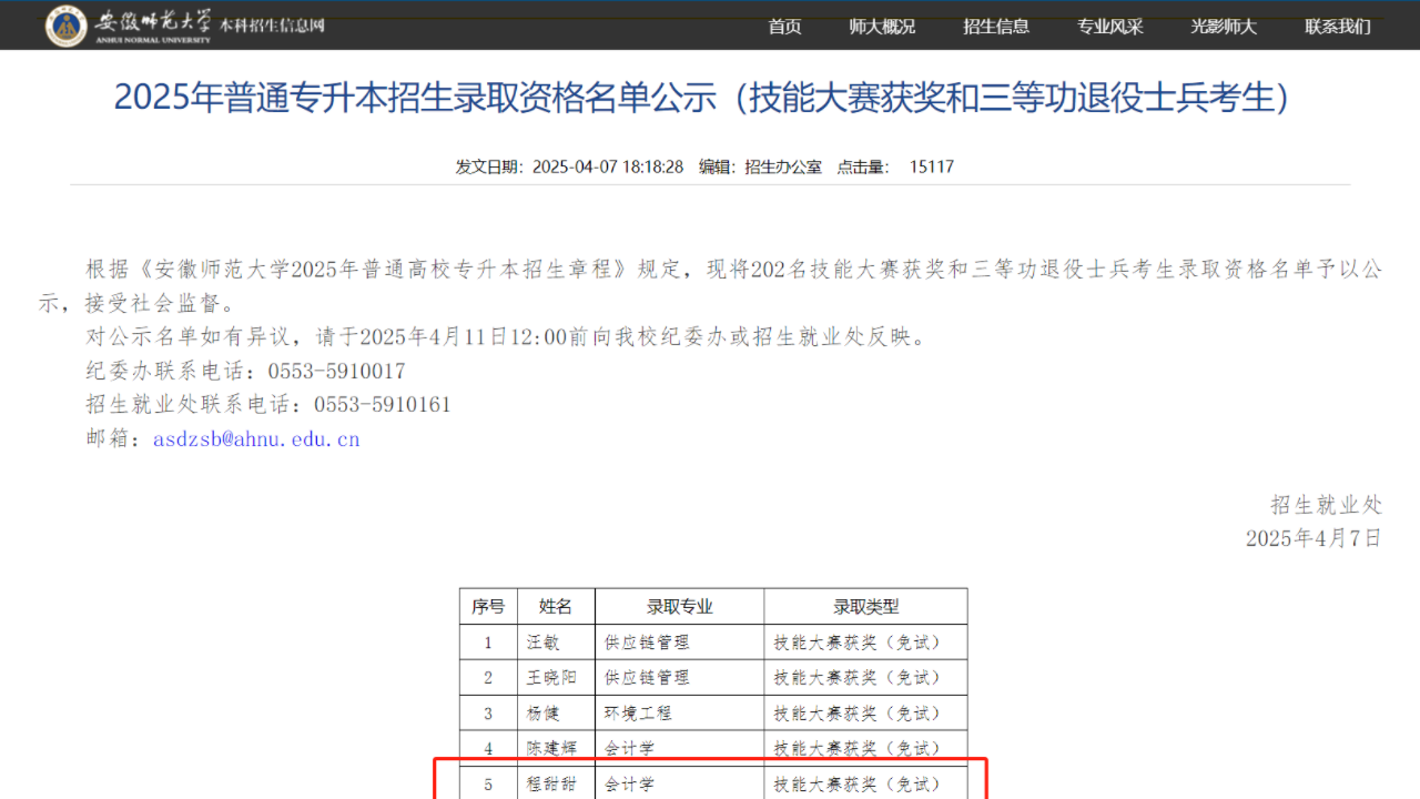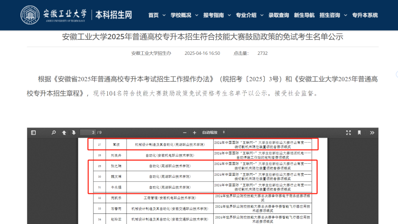 近日获悉,beat365机电工程学院、现代商务学院25届毕业生牛永强、常波、张之瑞、魏文博、程甜甜已通过2025年普高“专升本”免试直录资格申请,提前被安徽师范大学、安徽工业大学2所本科院校录取。